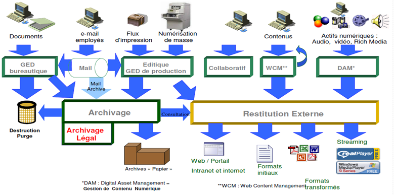 - Record Management ou Versionnage et Archivage : Permettre de gérer les phases de vie des documents après leur période d’utilité, trois type d'archives :