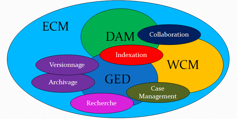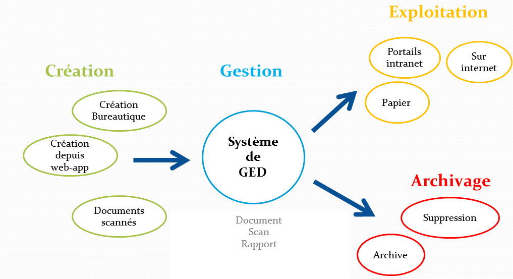 - GED : Prendre en charge le stockage, le partage et la restitution de documents électroniques. C’est le systèmes qui gère les documents avec un fond et une forme.