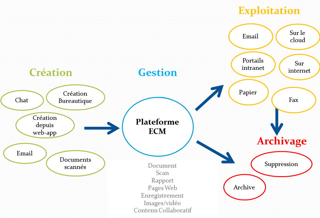Le cycle de vie d'un document dans un systeme ECM se raproche beaucoup de celui de la GED expliqué précédemment du fait qu'une GED est obligatoirement présente dans un ECM. En revanche, le processus est beaucoup plus complexe. C'est pour cela que nous allons reprendre celui de la GED en ajoutant des étapes.