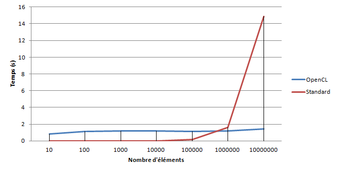 On peut clairement constater la parallélisation mise en place par opencl à partir d'un tableau de 1 000 000 d'éléments.