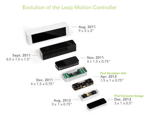 Le controleur Leap Motion a beaucoup évolué avant sa sortie au grand public. Les concepteurs du produit ont cherché à le rendre le plus esthétique et le plus performant possible pour l'utilisateur. Une dizaine de version ont été réalisées avant sa sortie, le 22 Juillet 2013.