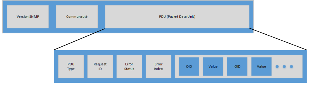 - PDU (Packet Data Unit) : Il contient toutes les informations utiles (les valeurs demandées ou les réponses à ces demandes).