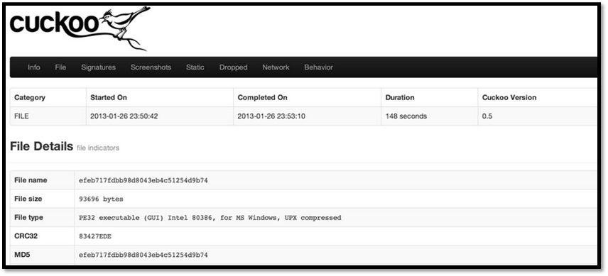 Exemple de rapport d'analyse généré par cuckoo sandbox