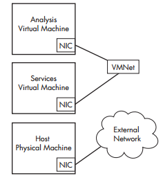 Ici, la machine physique exécute deux machines virtuelles. La première est dédiée à l'analyse et est connectée à la seconde machine qui se charge d'offrir des services (DNS, HTTP ...).