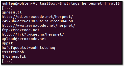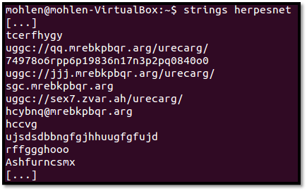 Analyse des chaines de caractères du malware herpesnet avec décodage.