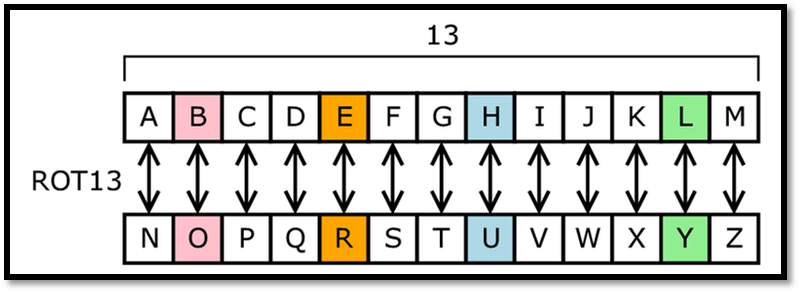 Pour comprendre ce type d'obfuscation, nous allons montrer en exemple l'algorithme ROT 13. Cet algorithme consiste à permuter chaque lettre d'une chaine selon le tableau suivant :