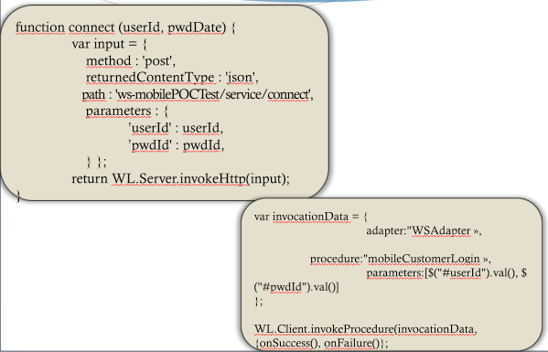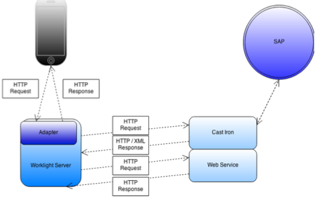Les données récupérées de SAP ne sont pas interprétables par le serveur Worklight. Il est donc impératif de mettre en place un système permettant d'effectuer une conversion entre le formalisme SAP et les informations interprétables par le serveur Worklight. Un ensemble de Web Services peuvent ensuite être mis en place afin de pouvoir récupérer ces informations formattées comme il se doit. Bien entendu, les requêtes et réponses des web services sont effectuées en JSON.