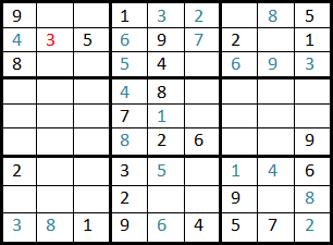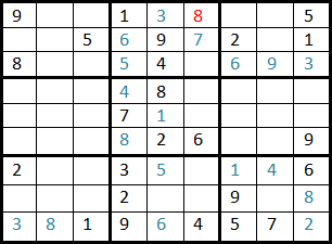 On effectue ce parcourt jusqu'à arriver à la première situation bloquante, la cellule n°23. Dans cette case aucune valeur de 1 à 9 n'est possible, on remonte donc à la cellule 22, oú il y a un 3, on reprend alors le test des valeurs pour cette case de 3 à 9.