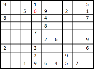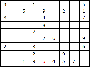 On part de la cellule n°1, on teste les valeurs possibles de 1 à 9. Le premier chiffre possible est 6, on place 6 dans la case et on passe à la suivante.