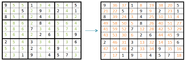 On classe les cases de celles ayant le moins de possibilités à celles en ayant le plus. On place ce classement dans une liste. On parcours la liste jusqu'à arriver à la derniere cellule de la liste. Pour chaque cellule de la liste: - On teste les valeurs de 1 à n²: - si la valeur est possible : - on l'inscrit dans la cellule et on passe à la suivante - sinon : - on remontre à la cellule suivante et on reprend le test des valeurs de 1 à n² à partir de la valeur déjà inscrite dans la cellule.