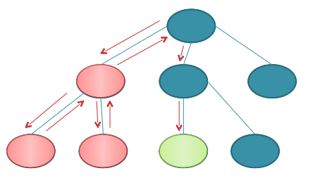 L'idée est de partir du noeud parent, descendre dans le premier noeud fils satisfaisant la contrainte. Ce noeud fils devient alors un noeud parent et l'on parcourt ensuite ses noeuds fils sous le même principe.Lorsque l'on a parcouru tous les noeuds fils d'un noeud et qu'aucun ne satisfait la contrainte, on remonte alors au noeud parent et on descend dans le noeud fils suivant. Si l'on arrive au dernier fils du premier noeud parent et qu'il ne satisfait pas la contrainte alors il n'existe pas de solution. La solution est identifiée lorsque l'on arrive à un noeud qui satisfait la contrainte et qui n'a pas de noeud fils.