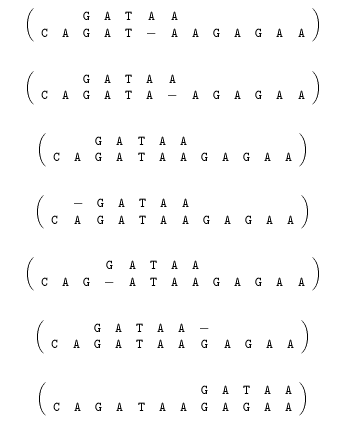 x = GATAA and y = CAGATAAGAGAA and k = 1